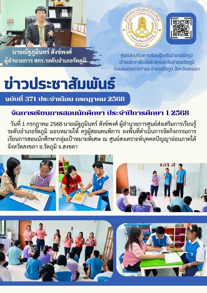 วันที่ 1 กรกฎาคม 2568 นายณัฐภูมินทร์ สังข์พงศ์ ผู้อำนวยการศูนย์ส่งเสริมการเรียนรู้ระดับอำเภอรัตภูมิ มอบหมายให้ ครูผู้สอนคนพิการ ลงพื้นที่ดำเนินการจัดกิจกรรมการเรียนการสอนนักศึกษากลุ่มเป้าหมายพิเศษ ณ ศูนย์สงเคราะห์บุคคลปัญญาอ่อนภาคใต้จังหวัดสงขลา อ.รัตภูมิ จ.สงขลา