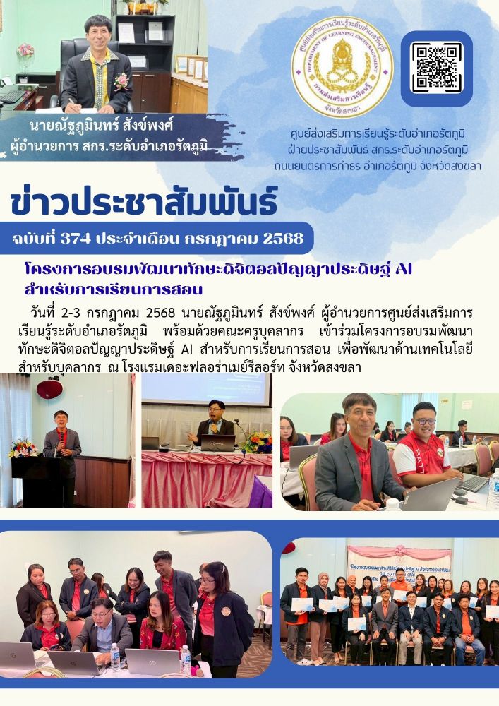 วันที่ 2-3 กรกฎาคม 2568 นายณัฐภูมินทร์ สังข์พงศ์ ผู้อำนวยการศูนย์ส่งเสริมการเรียนรู้ระดับอำเภอรัตภูมิ พร้อมด้วยคณะครูบุคลากร เข้าร่วมโครงการอบรมพัฒนาทักษะดิจิตอลปัญญาประดิษฐ์ AI สำหรับการเรียนการสอน เพื่อพัฒนาด้านเทคโนโลยีสำหรับบุคลากร ณ โรงแรมเดอะฟลอร่าเมย์รีสอร์ท จังหวัดสงขลา