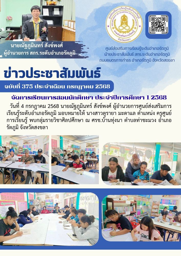 วันที่ 4 กรกฎาคม 2568 นายณัฐภูมินทร์ สังข์พงศ์ ผู้อำนวยการศูนย์ส่งเสริมการเรียนรู้ระดับอำเภอรัตภูมิ มอบหมายให้ นางสาวตูรายา มะดาแล ตำแหน่ง ครูศูนย์การเรียนรู้ พบกลุ่มรายวิชาศิลปศึกษา ณ ศรช.บ้านทุ่งนา ตำบลท่าชะมวง อำเภอรัตภูมิ จังหวัดสงขลา