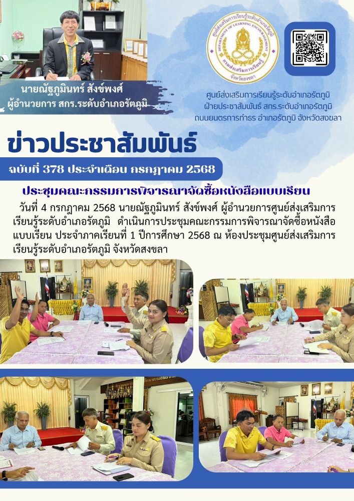 วันที่ 4 กรกฎาคม 2568 นายณัฐภูมินทร์ สังข์พงศ์ ผู้อำนวยการศูนย์ส่งเสริมการเรียนรู้ระดับอำเภอรัตภูมิ ดำเนินการประชุมคณะกรรมการพิจารณาจัดซื้อหนังสือแบบเรียน ประจำภาคเรียนที่ 1 ปีการศึกษา 2568 ณ ห้องประชุมศูนย์ส่งเสริมการเรียนรู้ระดับอำเภอรัตภูมิ จังหวัดสงขลา