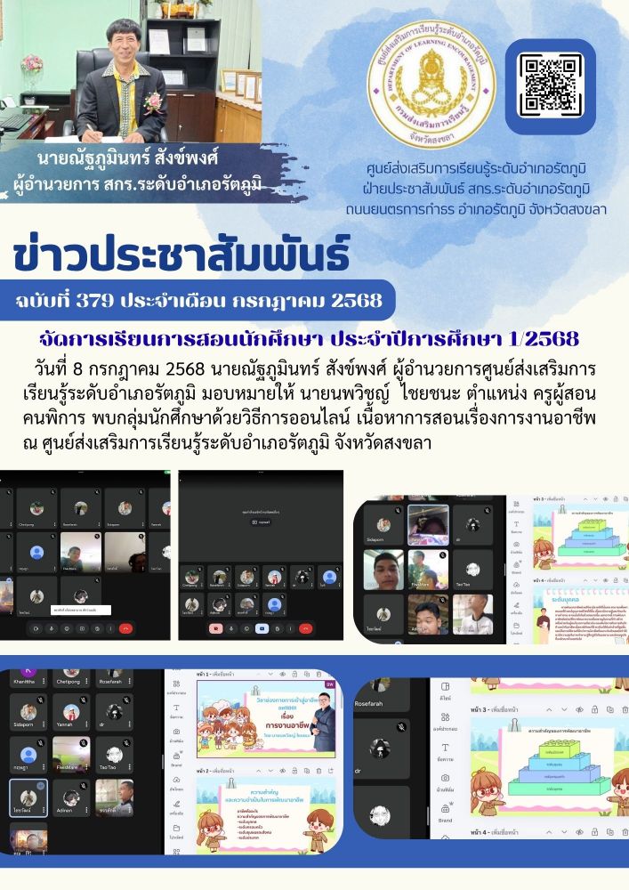วันที่ 8 กรกฎาคม 2568 นายณัฐภูมินทร์ สังข์พงศ์ ผู้อำนวยการศูนย์ส่งเสริมการเรียนรู้ระดับอำเภอรัตภูมิ มอบหมายให้ นายนพวิชญ์ ไชยชนะ ตำแหน่ง ครูผู้สอนคนพิการ พบกลุ่มนักศึกษาด้วยวิธีการออนไลน์ เนื้อหาการสอนเรื่องการงานอาชีพ ณ ศูนย์ส่งเสริมการเรียนรู้ระดับอำเภอรัตภูมิ จังหวัดสงขลา