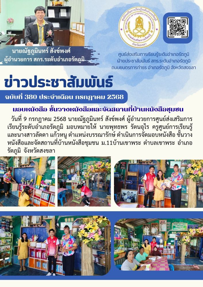 วันที่ 9 กรกฎาคม 2568 นายณัฐภูมินทร์ สังข์พงศ์ ผู้อำนวยการศูนย์ส่งเสริมการเรียนรู้ระดับอำเภอรัตภูมิ มอบหมายให้ นายพุทธพร รัตนอุไร ครูศูนย์การเรียนรู้และนางสาวลัดดา แก้วหนู ตำเเหน่งบรรณารักษ์ ดำเนินการจัดมอบหนังสือ ชั้นวางหนังสือและจัดสถานที่บ้านหนังสือชุมชน ม.11บ้านเขาพระ ตำบลเขาพระ อำเภอรัตภูมิ จังหวัดสงขลา