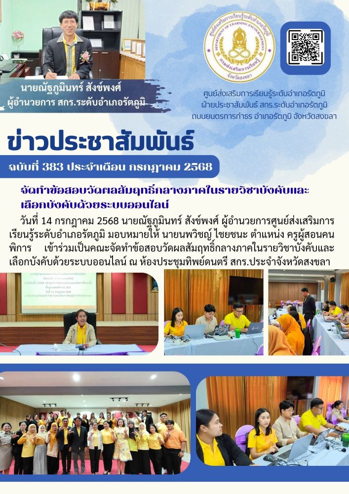 วันที่ 14 กรกฎาคม 2568 นายณัฐภูมินทร์ สังข์พงศ์ ผู้อำนวยการศูนย์ส่งเสริมการเรียนรู้ระดับอำเภอรัตภูมิ มอบหมายให้ นายนพวิชญ์ ไชยชนะ ตำแหน่ง ครูผู้สอนคนพิการ เข้าร่วมเป็นคณะจัดทำข้อสอบวัดผลสัมฤทธิ์กลางภาคในรายวิชาบังคับและเลือกบังคับด้วยระบบออนไลน์ ณ ห้องประชุมทิพย์ดนตรี สกร.ประจำจังหวัดสงขลา