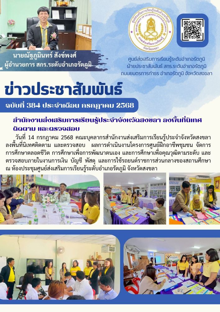 วันที่ 14 กรกฎาคม 2568 คณะบุคลากรสำนักงานส่งเสริมการเรียนรู้ประจำจังหวัดสงขลา ลงพื้นที่นิเทศติดตาม และตรวจสอบ ผลการดำเนินงานโครงการศูนย์ฝึกอาชีพชุมชน จัดการการศึกษาตลอดชีวิต การศึกษาเพื่อการพัฒนาตนเอง และการศึกษาเพื่อคุณวุฒิตามระดับ และตรวจสอบภายในงานการเงิน บัญชี พัสดุ และการใช้รถยนต์ราชการส่วนกลางของสถานศึกษา ณ ห้องประชุมศูนย์ส่งเสริมการเรียนรู้ระดับอำเภอรัตภูมิ จังหวัดสงขลา