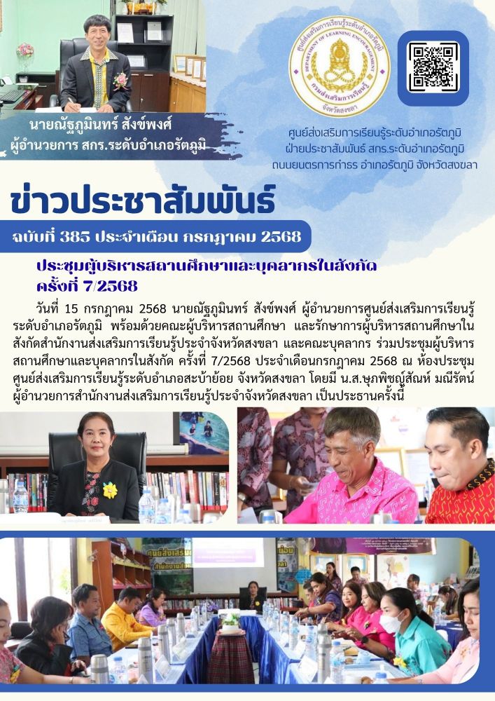 วันที่ 15 กรกฎาคม 2568 นายณัฐภูมินทร์ สังข์พงศ์ ผู้อำนวยการศูนย์ส่งเสริมการเรียนรู้ระดับอำเภอรัตภูมิ พร้อมด้วยคณะผู้บริหารสถานศึกษา และรักษาการผู้บริหารสถานศึกษาในสังกัดสำนักงานส่งเสริมการเรียนรู้ประจำจังหวัดสงขลา และคณะบุคลากร ร่วมประชุมผู้บริหารสถานศึกษาและบุคลากรในสังกัด ครั้งที่ 7/2568 ประจำเดือนกรกฎาคม 2568 ณ ห้องประชุม ศูนย์ส่งเสริมการเรียนรู้ระดับอำเภอสะบ้าย้อย จังหวัดสงขลา โดยมี น.ส.ษุภพิชญ์สัณห์ มณีรัตน์ ผู้อำนวยการสำนักงานส่งเสริมการเรียนรู้ประจำจังหวัดสงขลา เป็นประธานครั้งนี้