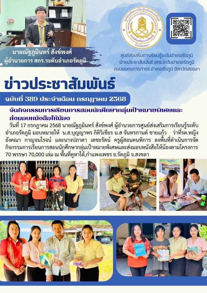 วันที่ 17 กรกฎาคม 2568 นายณัฐภูมินทร์ สังข์พงศ์ ผู้อำนวยการศูนย์ส่งเสริมการเรียนรู้ระดับอำเภอรัตภูมิ มอบหมายให้ น.ส.บุญญาพร กิติวิเชียร น.ส จันทรกานต์ ชายแก้ว ว่าที่รต.หญิงอังคณา กาญจนโรจน์ และนางปภาดา เตชะรัตน์ ครูผู้สอนคนพิการ ลงพื้นที่ดำเนินการจัดกิจกรรมการเรียนการสอนนักศึกษากลุ่มเป้าหมายพิเศษและส่งมอบหนังสือให้น้องตามโครงการ 70 พรรษา 70,000 เล่ม ณ พื้นที่คูหาใต้,กำแพงเพชร อ.รัตภูมิ จ.สงขลา