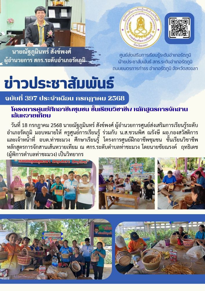 วันที่ 18 กรกฎาคม 2568 นายณัฐภูมินทร์ สังข์พงศ์ ผู้อำนวยการศูนย์ส่งเสริมการเรียนรู้ระดับอำเภอรัตภูมิ มอบหมายให้ ครูศูนย์การเรียนรู้ ร่วมกับ น.ส.ชวนพิศ ณรังษี ผอ.กองสวัสดิการ และเจ้าหน้าที่ อบต.ท่าชะมวง ศึกษาเรียนรู้ โครงการศูนย์ฝึกอาชีพชุมชน ชั้นเรียนวิชาชีพ หลักสูตรการจักสานเส้นหวายเทียม ณ ศกร.ระดับตำบลท่าชะมวง โดยนายชัยณรงค์ ฤทธิเดช (ผู้พิการตำบลท่าชะมวง) เป็นวิทยากร