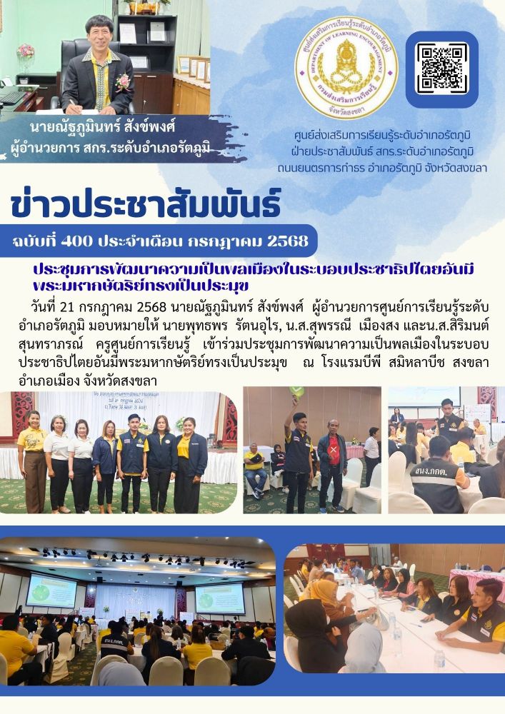 วันที่ 21 กรกฎาคม 2568 นายณัฐภูมินทร์ สังข์พงศ์ ผู้อำนวยการศูนย์การเรียนรู้ระดับอำเภอรัตภูมิ มอบหมายให้ นายพุทธพร รัตนอุไร, น.ส.สุพรรณี เมืองสง และน.ส.สิริมนต์ สุนทราภรณ์ ครูศูนย์การเรียนรู้ เข้าร่วมประชุมการพัฒนาความเป็นพลเมืองในระบอบประชาธิปไตยอันมีพระมหากษัตริย์ทรงเป็นประมุข ณ โรงแรมบีพี สมิหลาบีช สงขลา อำเภอเมือง จังหวัดสงขลา