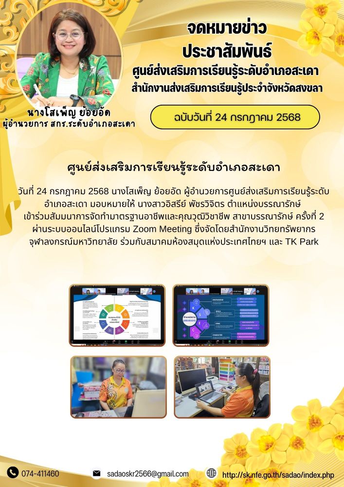 ศูนย์ส่งเสริมการเรียนรู้ระดับอำเภอสะเดา เข้าร่วมสัมมนาการจัดทำมาตรฐานอาชีพและคุณวุฒิวิชาชีพ สาขาบรรณารักษ์ ครั้งที่ 2 ผ่านระบบออนไลน์โปรแกรม Zoom Meeting