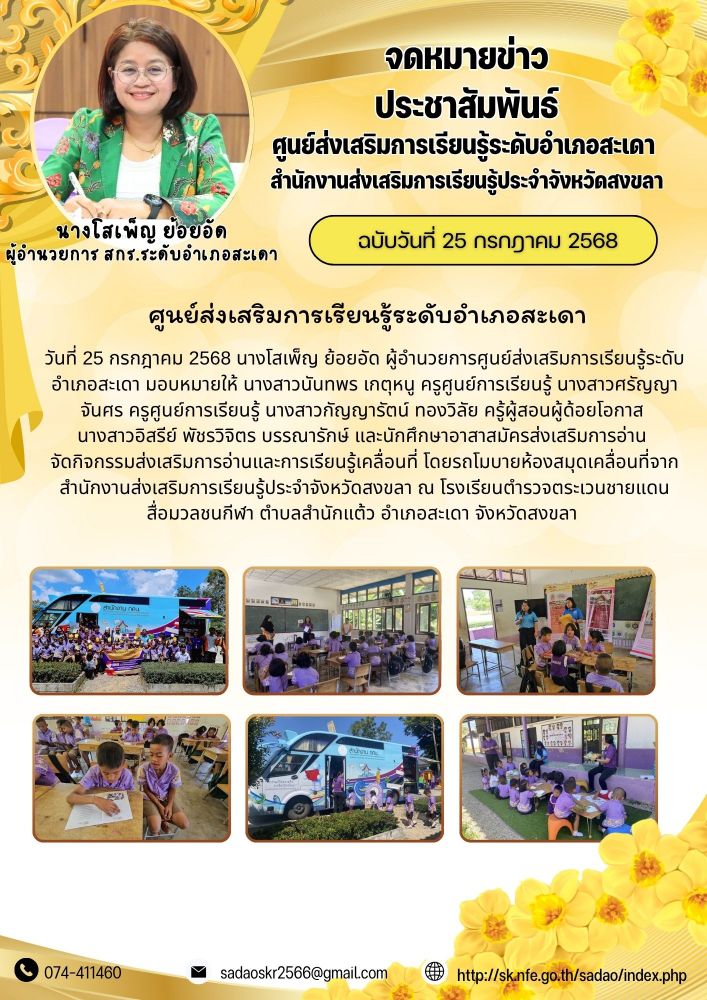 ศูนย์ส่งเสริมการเรียนรู้ระดับอำเภอสะเดา จัดกิจกรรมส่งเสริมการอ่านและการเรียนรู้เคลื่อนที่ โดยรถโมบายห้องสมุดเคลื่อนที่จากสำนักงานส่งเสริมการเรียนรู้ประจำจังหวัดสงขลา