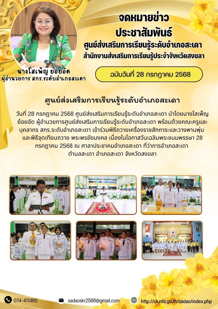 ศูนย์ส่งเสริมการเรียนรู้ระดับอำเภอสะเดา เข้าร่วมพิธีถวายเครื่องราชสักการะและวางพานพุ่ม และพิธีจุดเทียนถวาย พระพรชัยมงคล เนื่องในโอกาสวันเฉลิมพระชนมพรรษา 28 กรกฎาคม 2568
