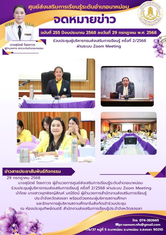 นางสุนิตย์ ไชยถาวร ผู้อำนวยการศูนย์ส่งเสริมการเรียนรู้ระดับอำเภอนาหม่อม ร่วมประชุมผู้บริหารกรมส่งเสริมการเรียนรู้ ครั้งที่ 2/2568 ผ่านระบบ Zoom Meeting