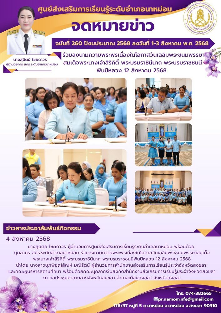 นางสุนิตย์ ไชยถาวร ผู้อำนวยการศูนย์ส่งเสริมการเรียนรู้ระดับอำเภอนาหม่อม พร้อมด้วย บุคลากร สกร.ระดับอำเภอนาหม่อม ร่วมลงนามถวายพระพรเนื่องในโอกาสวันเฉลิมพระชนมพรรษาสมเด็จพระนางเจ้าสิริกิติ์ พระบรมราชินีนาถ พระบรมราชชนนีพันปีหลวง 12 สิงหาคม 2568