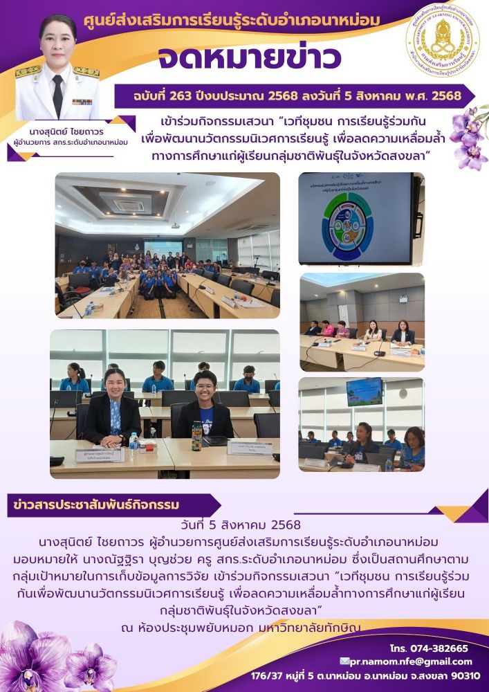 นางสุนิตย์ ไชยถาวร ผู้อำนวยการศูนย์ส่งเสริมการเรียนรู้ระดับอำเภอนาหม่อม มอบหมายให้ นางณัฐฐิรา บุญช่วย ครู สกร.ระดับอำเภอนาหม่อม ซึ่งเป็นสถานศึกษาตามกลุ่มเป้าหมายในการเก็บข้อมูลการวิจัย เข้าร่วมกิจกรรมเสวนา “เวทีชุมชน การเรียนรู้ร่วมกันเพื่อพัฒนานวัตกรรมนิเวศการเรียนรู้ เพื่อลดความเหลื่อมล้ำทางการศึกษาแก่ผู้เรียนกลุ่มชาติพันธุ์ในจังหวัดสงขลา”