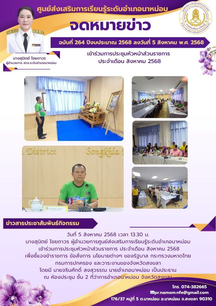 นางสุนิตย์ ไชยถาวร ผู้อำนวยการศูนย์ส่งเสริมการเรียนรู้ระดับอำเภอนาหม่อม เข้าร่วมการประชุมหัวหน้าส่วนราชการ ประจำเดือน สิงหาคม 2568 เพื่อชี้แจงข้าราชการ ข้อสั่งการ นโยบายต่างๆ ของรัฐบาล กระทรวงมหาดไทย กรมการปกครอง และวาระงานของจังหวัดสงขลา