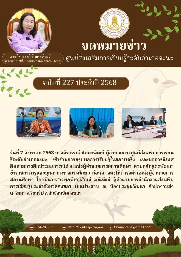 นางจีรวรรณ์ ปัตตะพัฒน์ ผู้อำนวยการศูนย์ส่งเสริมการเรียนรู้ระดับอำเภอจะนะ เข้าร่วมการสรุปผลการเรียนรู้ในสภาพจริง และผลการนิเทศติดตามการฝึกประสบการณ์ตำแหน่งผู้อำนวยการสถานศึกษา ตามหลักสูตรพัฒนาข้าราชการครูและบุคลากรทางการศึกษา ก่อนแต่งตั้งให้ดำรงตำแหน่งผู้อำนวยการสถานศึกษา โดยมีนางสาวษุภพิชญ์สัณห์ มณีรัตน์ ผู้อำนวยการสำนักงานส่งเสริมการเรียนรู้ประจำจังหวัดสงขลา เป็นประธาน