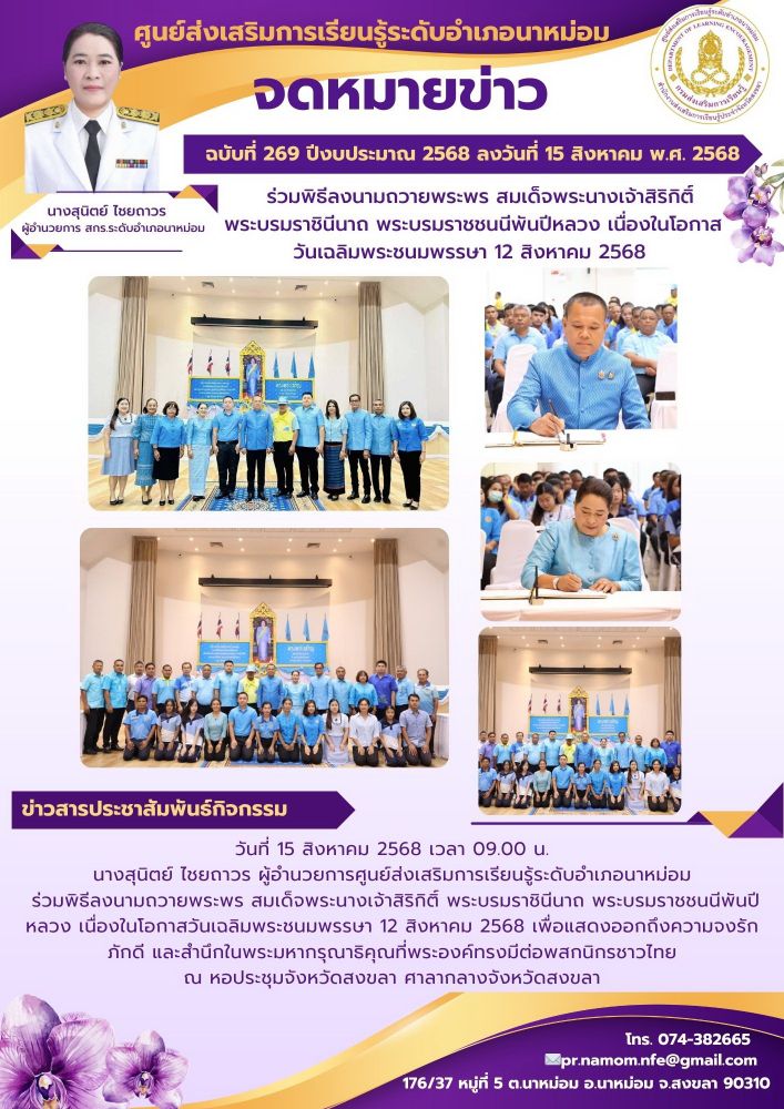 นางสุนิตย์ ไชยถาวร ผู้อำนวยการศูนย์ส่งเสริมการเรียนรู้ระดับอำเภอนาหม่อม ร่วมพิธีลงนามถวายพระพร สมเด็จพระนางเจ้าสิริกิติ์ พระบรมราชินีนาถ พระบรมราชชนนีพันปีหลวง เนื่องในโอกาสวันเฉลิมพระชนมพรรษา 12 สิงหาคม 2568 เพื่อแสดงออกถึงความจงรักภักดี และสำนึกในพระมหากรุณาธิคุณที่พระองค์ทรงมีต่อพสกนิกรชาวไทย