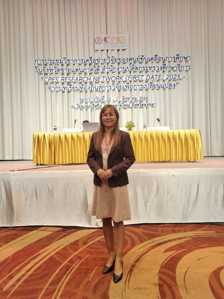 นางสาวศรัญญา จินตุลา ผู้อำนวยการศูนย์ส่งเสริมการเรียนรู้ระดับอำเภอเมืองสงขลา มอบหมายให้นางสาวกัลยา ธานีรัตน์ ครูศูนย์การเรียนรู้ เข้าร่วมประชุมวิชาการเครือข่ายวิจัยของศูนย์ขับเคลื่อนการศึกษาในจังหวัดชายแดนภาคใต้ ครั้งที่ 1 หัวข้อ "จากบทเรียนท้องถิ่นสู่การวิจัยเพื่อการเปลี่ยนแปลง" ระหว่างวันที่ 26-27 สิงหาคม 2568 ณโรงแรมบุรีศรีภู อำเภอหาดใหญ่จังหวัดสงขลา