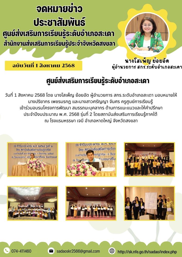 ศูนย์ส่งเสริมการเรียนรู้ระดับอำเภอสะเดา เข้าร่วมอบรมโครงการพัฒนา สมรรถนะบุคลากร ด้านการแนะแนวและให้คำปรึกษา ประจำปีงบประมาณ พ.ศ. 2568