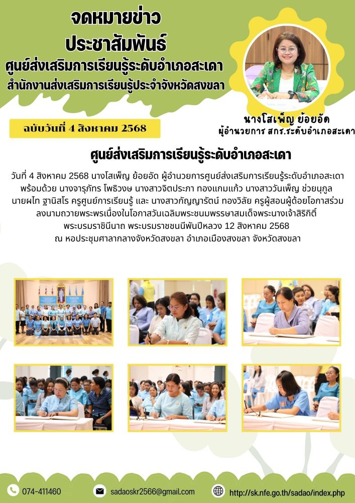 ศูนย์ส่งเสริมการเรียนรู้ระดับอำเภอสะเดา เข้าร่วมลงนามถวายพระพรเนื่องในโอกาสวันเฉลิมพระชนมพรรษาสมเด็จพระนางเจ้าสิริกิติ์ พระบรมราชินีนาถ พระบรมราชชนนีพันปีหลวง 12 สิงหาคม 2568