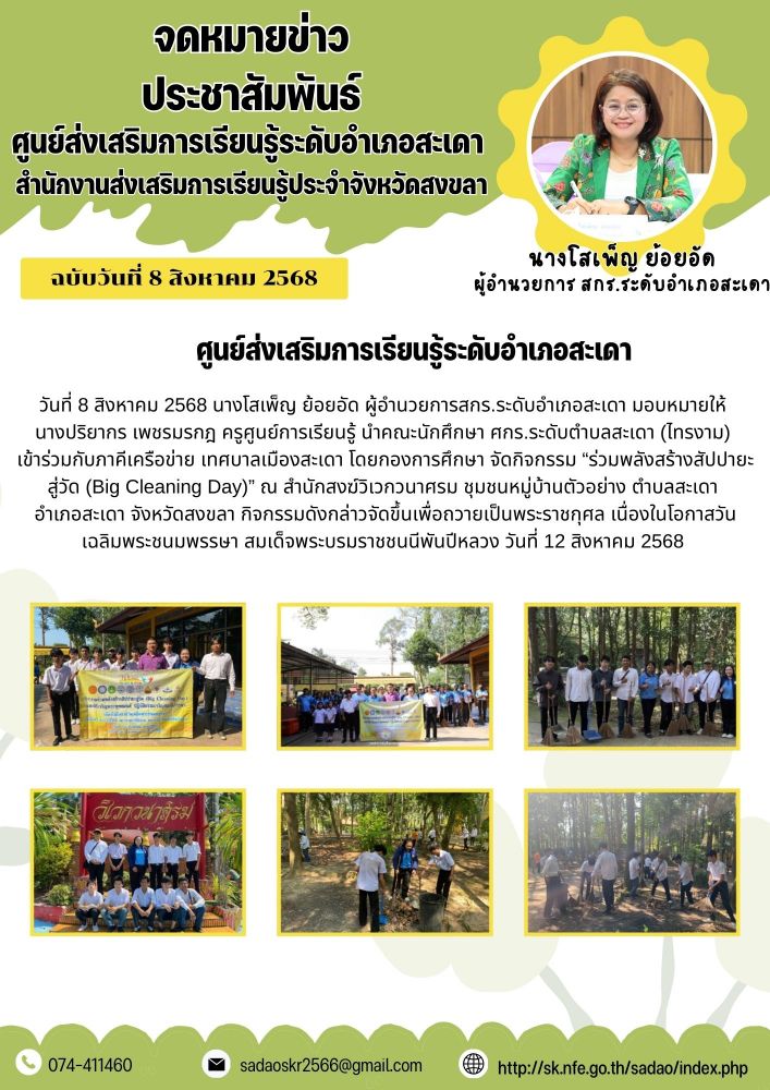 ศูนย์ส่งเสริมการเรียนรู้ระดับอำเภอสะเดา เข้าร่วมกับภาคีเครือข่าย เทศบาลเมืองสะเดา โดยกองการศึกษา จัดกิจกรรม “ร่วมพลังสร้างสัปปายะสู่วัด (Big Cleaning Day)”