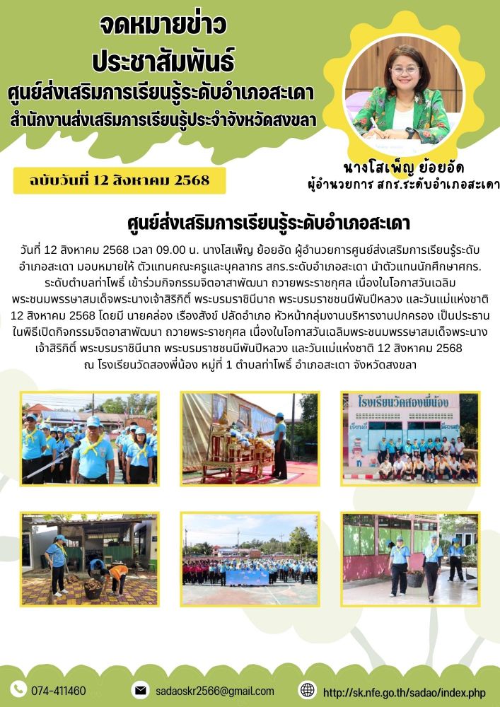 ศูนย์ส่งเสริมการเรียนรู้ระดับอำเภอสะเดา เข้าร่วมกิจกรรมจิตอาสาพัฒนา ถวายพระราชกุศล เนื่องในโอกาสวันเฉลิมพระชนมพรรษาสมเด็จพระนางเจ้าสิริกิติ์ พระบรมราชินีนาถ พระบรมราชชนนีพันปีหลวง และวันแม่แห่งชาติ 12 สิงหาคม 2568