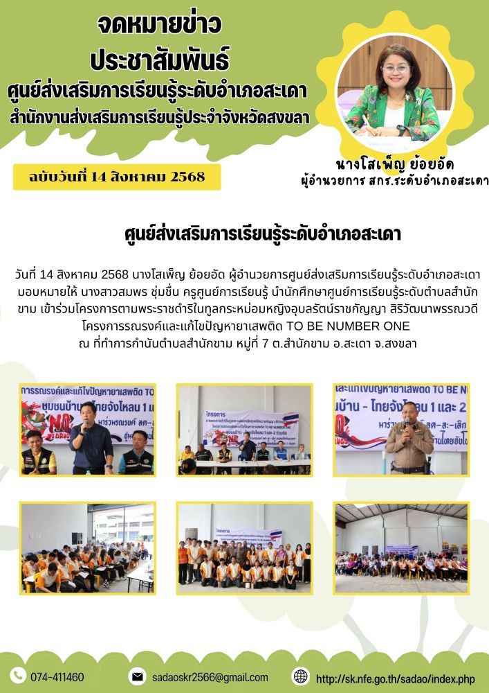 ศูนย์ส่งเสริมการเรียนรู้ระดับอำเภอสะเดา เข้าร่วมโครงการตามพระราชดำริในทูลกระหม่อมหญิงอุบลรัตน์ราชกัญญา สิริวัฒนาพรรณวดี โครงการรณรงค์และแก้ไขปัญหายาเสพติด TO BE NUMBER ONE