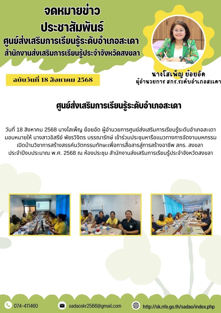 ศูนย์ส่งเสริมการเรียนรู้ระดับอำเภอสะเดา เข้าร่วมประชุมหารือแนวทางการจัดงานมหกรรมเปิดบ้านวิชาการสร้างสรรค์นวัตกรรมทักษะเพื่อการสื่อสารสู่การสร้างอาชีพ สกร. สงขลา ประจำปีงบประมาณ พ.ศ. 2568
