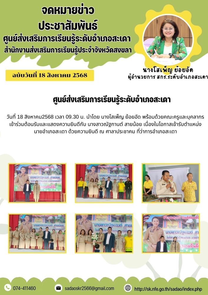 ศูนย์ส่งเสริมการเรียนรู้ระดับอำเภอสะเดา เข้าร่วมต้อนรับและแสดงความยินดีกับ นางสาวณัฐกานต์ สายน้อย เนื่องในโอกาสเข้ารับตำแหน่งนายอำเภอสะเดา