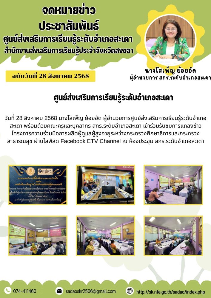 ศูนย์ส่งเสริมการเรียนรู้ระดับอำเภอสะเดา ข้าร่วมรับชมการแถลงข่าวโครงการความร่วมมือการผลิตผู้ดูแลผู้สูงอายุระหว่างกระทรวงศึกษาธิการและกระทรวงสาธารณสุข ผ่านไลฟ์สด Facebook ETV Channel