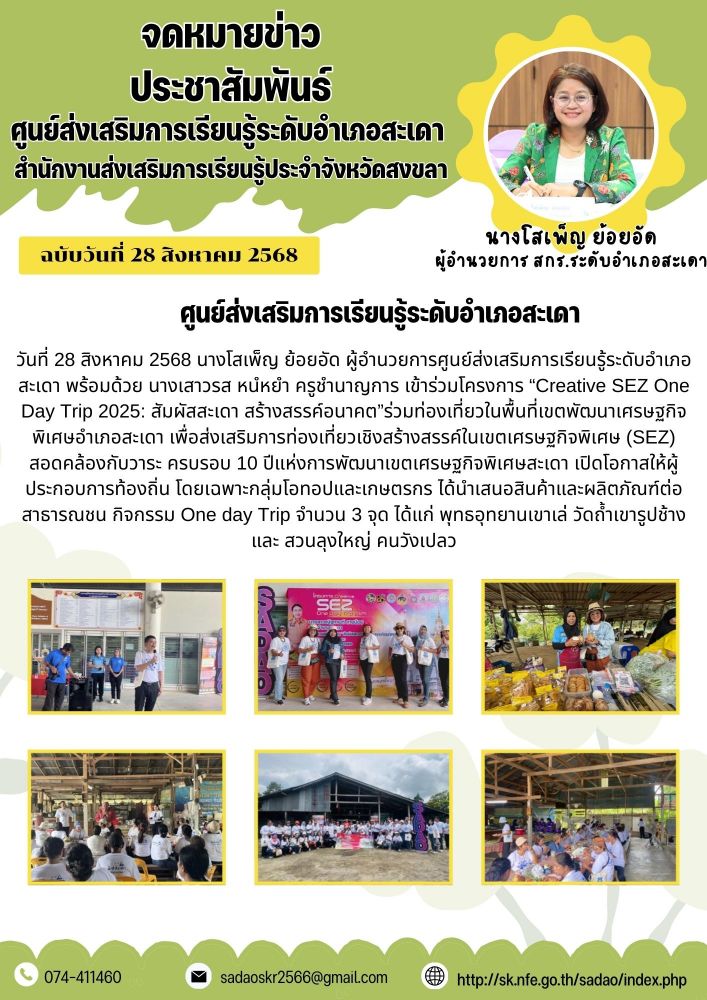 ศูนย์ส่งเสริมการเรียนรู้ระดับอำเภอสะเดา เข้าร่วมโครงการ “Creative SEZ One Day Trip 2025: สัมผัสสะเดา สร้างสรรค์อนาคต”ร่วมท่องเที่ยวในพื้นที่เขตพัฒนาเศรษฐกิจพิเศษอำเภอสะเดา