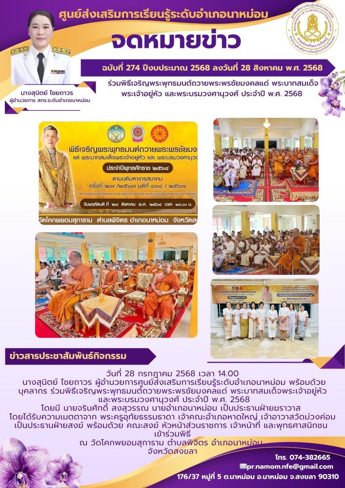 นางสุนิตย์ ไชยถาวร ผู้อำนวยการศูนย์ส่งเสริมการเรียนรู้ระดับอำเภอนาหม่อม พร้อมด้วยบุคลากร ร่วมพิธีเจริญพระพุทธมนต์ถวายพระพรชัยมงคลแด่ พระบาทสมเด็จพระเจ้าอยู่หัว และพระบรมวงศานุวงศ์ ประจำปี พ.ศ. 2568
