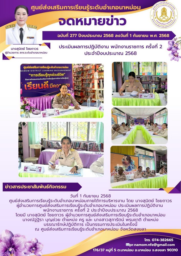 ศูนย์ส่งเสริมการเรียนรู้ระดับอำเภอนาหม่อมภายใต้การบริหารงาน โดย นางสุนิตย์ ไชยถาวร ผู้อำนวยการศูนย์ส่งเสริมการเรียนรู้ระดับอำเภอนาหม่อม ประเมินผลการปฏิบัติงาน พนักงานราชการ ครั้งที่ 2 ประจำปีงบประมาณ 2568