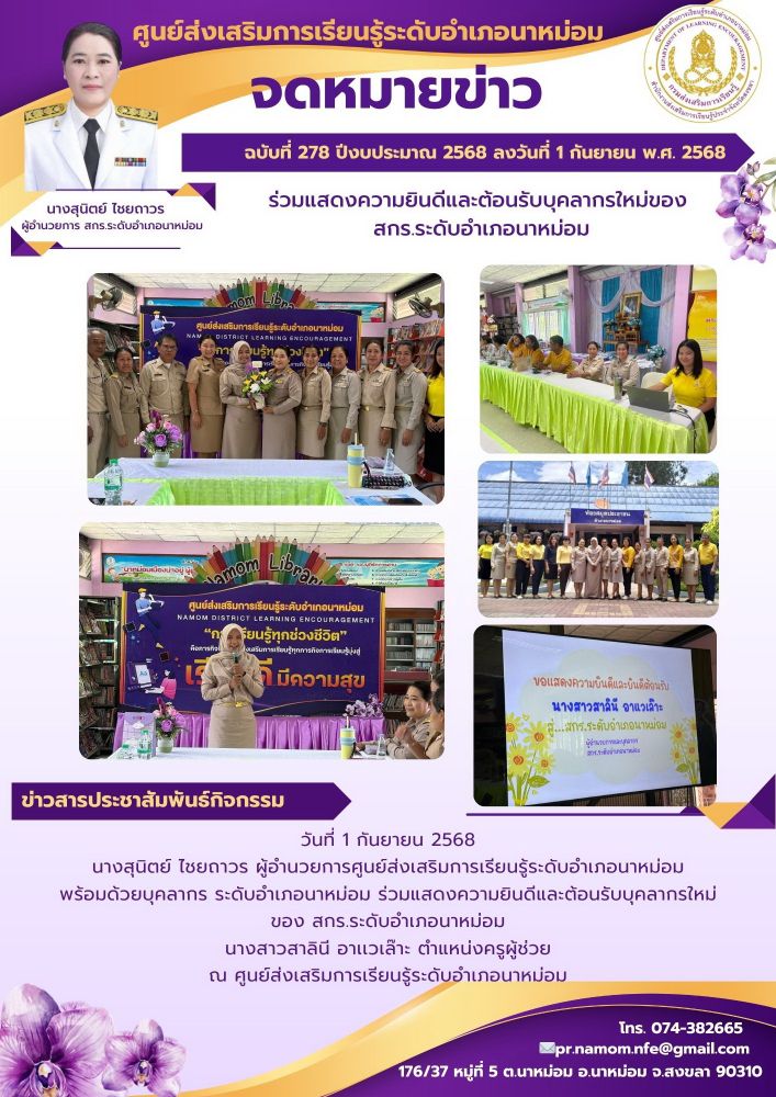 นางสุนิตย์ ไชยถาวร ผู้อำนวยการศูนย์ส่งเสริมการเรียนรู้ระดับอำเภอนาหม่อม พร้อมด้วยบุคลากร ระดับอำเภอนาหม่อม ร่วมแสดงความยินดีและต้อนรับบุคลากรใหม่ของ สกร.ระดับอำเภอนาหม่อม