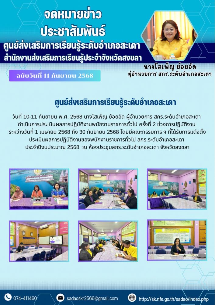 ศูนย์ส่งเสริมการเรียนรู้ระดับอำเภอสะเดา ดำเนินการประเมินผลการปฏิบัติงานพนักงานราชการทั่วไป ครั้งที่ 2 ช่วงการปฏิบัติงาน ระหว่างวันที่ 1 เมษายน 2568 ถึง 30 กันยายน 2568
