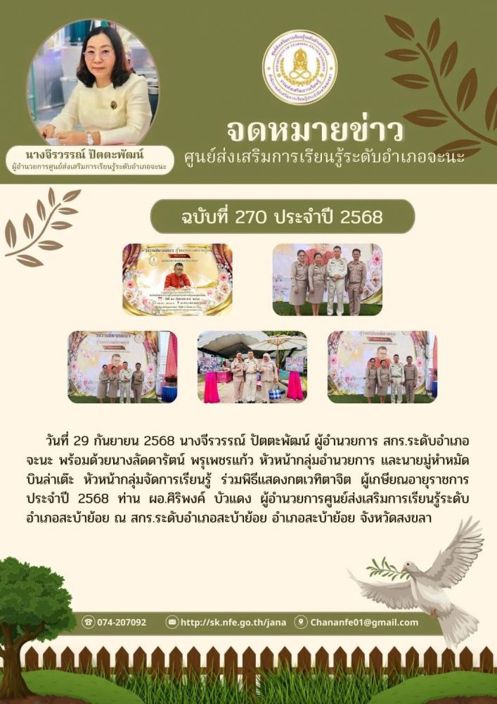 นางจีรวรรณ์ ปัตตะพัฒน์ ผู้อำนวยการศูนย์ส่งเสริมการเรียนรู้ระดับอำเภอจะนะ พร้อมด้วยนางลัดดารัตน์ พรุเพชรแก้ว หัวหน้ากลุ่มอำนวยการ และนายมู่หำหมัด บินล่าเต๊ะ หัวหน้ากลุ่มจัดการเรียนรู้ ร่วมพิธีแสดงกตเวทิตาจิต ผู้เกษียณอายุราชการ ประจำปี 2568 ท่าน ผอ.ศิริพงค์ บัวแดง ผู้อำนวยการศูนย์ส่งเสริมการเรียนรู้ระดับอำเภอสะบ้าย้อย