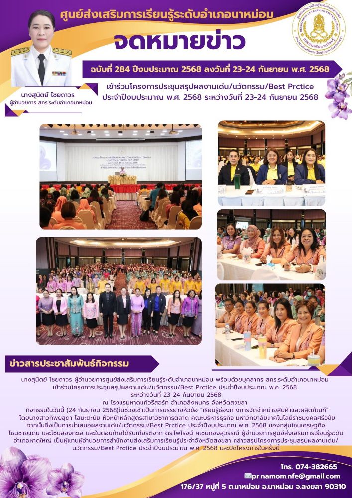 นางสุนิตย์ ไชยถาวร ผู้อำนวยการศูนย์ส่งเสริมการเรียนรู้ระดับอำเภอนาหม่อม พร้อมด้วยบุคลากร สกร.ระดับอำเภอนาหม่อม เข้าร่วมโครงการประชุมสรุปผลงานเด่น/นวัตกรรม/Best Prctice ประจำปีงบประมาณ พ.ศ. 2568 ระหว่างวันที่ 23-24 กันยายน 2568