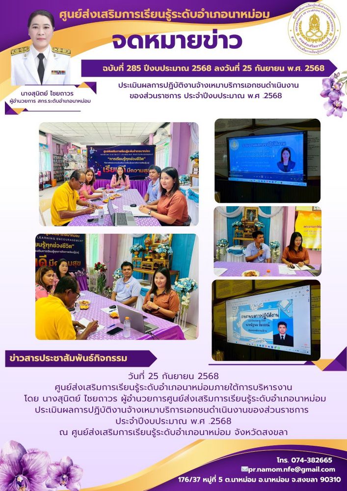 ศูนย์ส่งเสริมการเรียนรู้ระดับอำเภอนาหม่อมภายใต้การบริหารงาน โดย นางสุนิตย์ ไชยถาวร ผู้อำนวยการศูนย์ส่งเสริมการเรียนรู้ระดับอำเภอนาหม่อม ประเมินผลการปฏิบัติงานจ้างเหมาบริการเอกชนดำเนินงานของส่วนราชการ ประจำปีงบประมาณ พ.ศ .2568