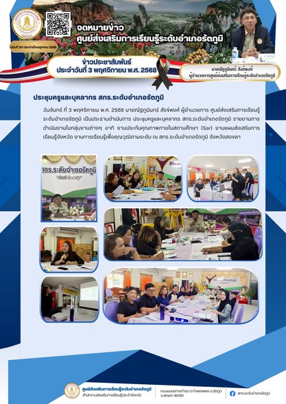 นายณัฐภูมินทร์ สังข์พงศ์ ผู้อำนวยการ ศูนย์ส่งเสริมการเรียนรู้ระดับอำเภอรัตภูมิ เป็นประธานดำเนินการ ประชุมครูและบุคลากร สกร.ระดับอำเภอรัตภูมิ รายงานการดำเนินงานในกลุ่มงานต่างๆ อาทิ งานประกันคุณภาพภายในสถานศึกษา (Sar) งานแผนส่งเสริมการเรียนรู้จังหวัด งานการเรียนรู้เพื่อคุณวุฒิตามระดับ ณ สกร.ระดับอำเภอรัตภูมิ จังหวัดสงขลา