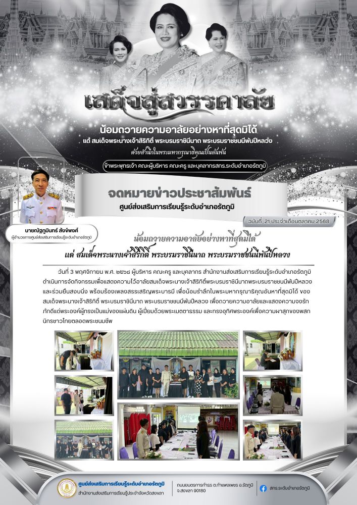 ผู้บริหาร คณะครู และบุคลากร สำนักงานส่งเสริมการเรียนรู้ระดับอำเภอรัตภูมิ ดำเนินการจัดกิจกรรมเพื่อแสดงความไว้อาลัยสมเด็จพระนางเจ้าสิริกิติ์พระบรมราชินีนาถพระบรมราชชนนีพันปีหลวง และร่วมยืนสงบนิ่ง พร้อมร้องเพลงสรรเสริญพระบารมี เพื่อน้อมรำลึกในพระมหากรุณาธิคุณอันหาที่สุดมิได้ ของสมเด็จพระนางเจ้าสิริกิติ์ พระบรมราชินีนาถ พระบรมราชชนนีพันปีหลวง
