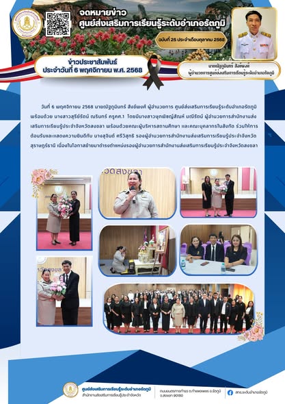 โดยมี นางสาวษุภพิชญ์สัณห์ มณีรัตน์ ผู้อำนวยการสำนักงานส่งเสริมการเรียนรู้ประจำจังหวัดสงขลา พร้อมด้วยคณะผู้บริหารสถานศึกษา เเละคณะบุคลากรในสังกัด ร่วมให้การต้อนรับและเเสดงความยินดีกับ นางสุจินต์ ศรีวิสุทธิ รองผู้อำนวยการสำนักงานส่งเสริมการเรียนรู้ประจำจังหวัดสุราษฎร์ธานี เนื่องในโอกาสย้ายมาดำรงตำแหน่งรองผู้อำนวยการสำนักงานส่งเสริมการเรียนรู้ประจำจังหวัดสงขลา