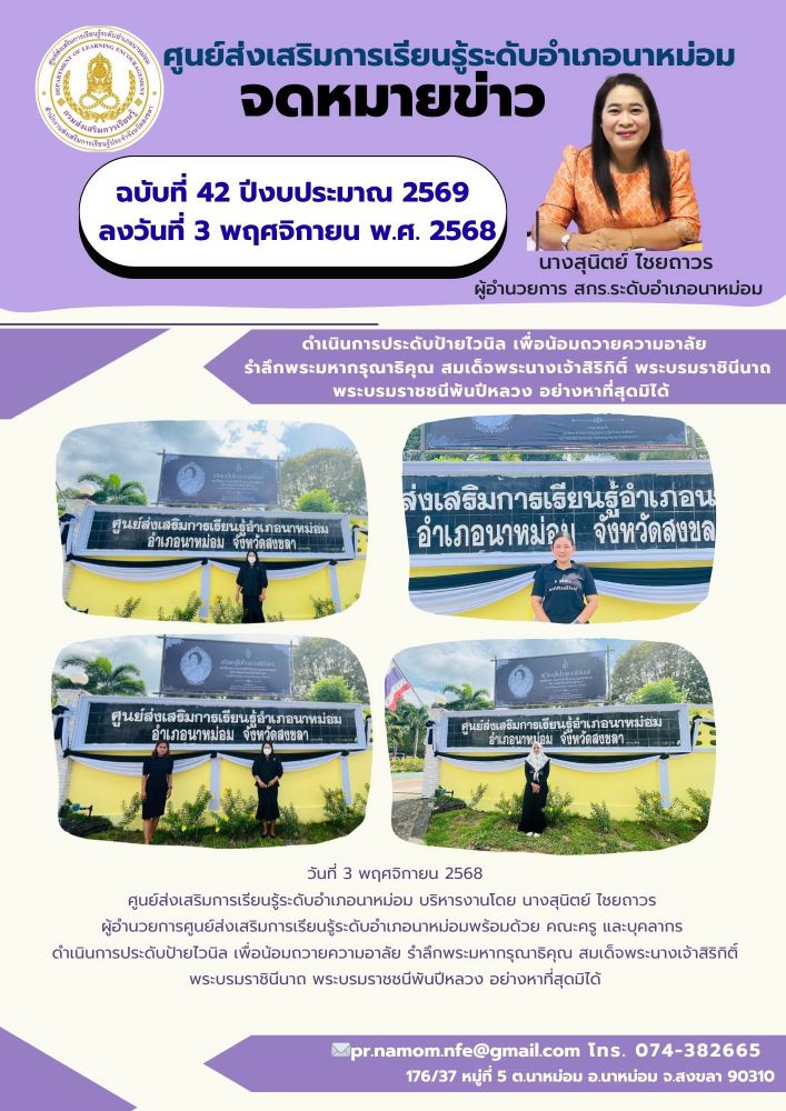 ศูนย์ส่งเสริมการเรียนรู้ระดับอำเภอนาหม่อม บริหารงานโดย นางสุนิตย์ ไชยถาวร ผู้อำนวยการศูนย์ส่งเสริมการเรียนรู้ระดับอำเภอนาหม่อมพร้อมด้วย คณะครู และบุคลากร ดำเนินการประดับป้ายไวนิล เพื่อน้อมถวายความอาลัย รำลึกพระมหากรุณาธิคุณ สมเด็จพระนางเจ้าสิริกิติ์ พระบรมราชินีนาถ พระบรมราชชนีพันปีหลวง อย่างหาที่สุดมิได้