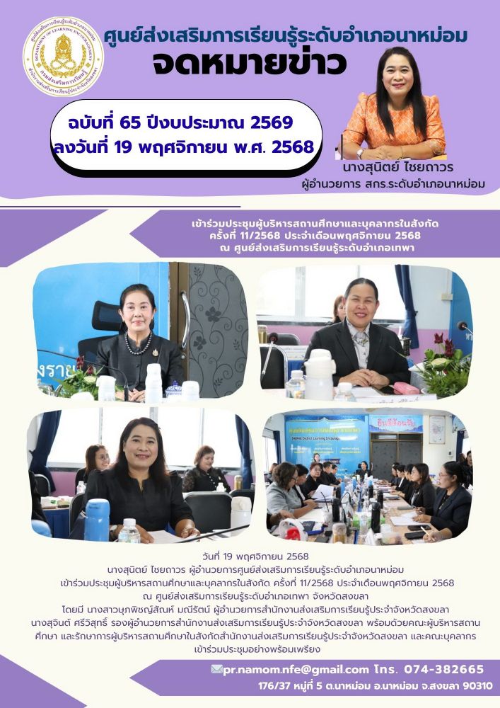 นางสุนิตย์ ไชยถาวร ผู้อำนวยการศูนย์ส่งเสริมการเรียนรู้ระดับอำเภอนาหม่อม เข้าร่วมประชุมผู้บริหารสถานศึกษาและบุคลากรในสังกัด ครั้งที่ 11/2568 ประจำเดือนพฤศจิกายน 2568