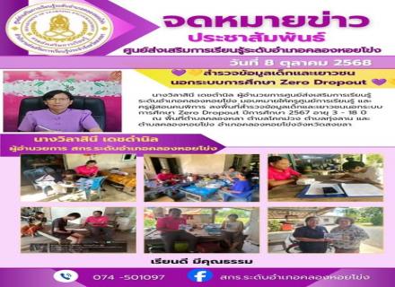วันที่ 8 ตุลาคม 2568 นางวิลาสินี เดชดำนิล ผู้อำนวยการศูนย์ส่งเสริมการเรียนรู้ระดับอำเภอคลองหอยโข่ง มอบหมายให้ครูศูนย์การเรียนรู้ ลงพื้นที่สำรวจข้อมูลเด็กและเยาวชนนอกระบบการศึกษา Zero Dropout ปีการศึกษา 2567 อายุ 3 - 18 ปี และประชาสัมพันธ์รับสมัค  เข้าชม :  [4]