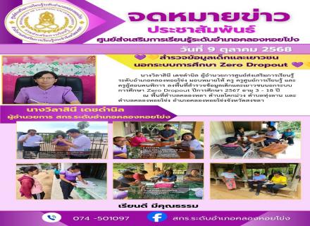วันที่ 9 ตุลาคม 2568 นางวิลาสินี เดชดำนิล ผู้อำนวยการศูนย์ส่งเสริมการเรียนรู้ระดับอำเภอคลองหอยโข่ง มอบหมายให้ ครู ครูศูนย์การเรียนรู้ และครูผู้สอนคนพิการ ลงพื้นที่สำรวจข้อมูลเด็กและเยาวชนนอกระบบการศึกษา Zero Dropout ปีการศึกษา 2567 อายุ 3 - 18 ปี  เข้าชม :  [6]