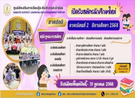 เปิดรับสมัครนักศึกษาใหม่ ศูนย์ส่งเสริมการเรียนรู้อำเภอสะบ้าย้อย รับสมัครนักศึกษา ภาคเรียนที่ 2 ปีการศึกษา 2568