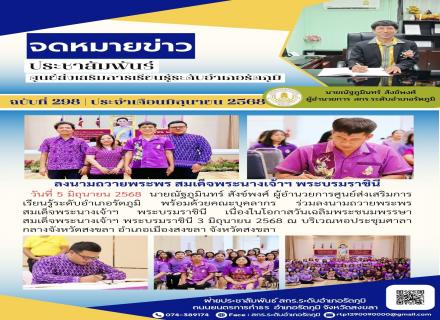 วันที่ 5 มิถุนายน 2568 นายณัฐภูมินทร์ สังข์พงศ์ ผู้อำนวยการศูนย์ส่งเสริมการเรียนรู้ระดับอำเภอรัตภูมิ พร้อมด้วยคณะบุคลากร ร่วมลงนามถวายพระพร สมเด็จพระนางเจ้าฯ พระบรมราชินี เนื่องในโอกาสวันเฉลิมพระชนมพรรษา สมเด็จพระนางเจ้าฯ พระบรมราชินี 3 มิถุนายน 2568 ณ บ |
