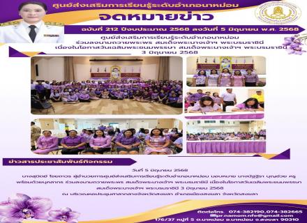 5 มิถุนายน 2568 นางสาวศรัญญา จินตุลา ผู้อำนวยการศูนย์ส่งเสริมการเรียนรู้ระดับอำเภอเมืองสงขลา พร้อมด้วยคณะครูและบุคลากร สกร.ระดับอำเภอเมืองสงขลา ร่วมลงนามถวายพระพร สมเด็จพระนางเจ้าฯ พระบรมราชินี เนื่องในโอกาสวันเฉลิมพระชนมพรรษา สมเด็จพระนางเจ้าฯ พระบรมราชิ