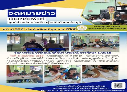 วันที่ 5 มิถุนายน 2568 นายณัฐภูมินทร์ สังข์พงศ์ ผู้อำนวยการ สกร.ระดับอำเภอรัตภูมิ มอบหมายให้ นางสาวซารียะ มะหลี ตำแหน่ง ครูศูนย์การเรียนรู้ พบกลุ่มจัดการเรียนการสอนนักศึกษา ในรายวิชา คณิตศาสตร์ ณ ศรช.บ้านวังคุย ตำบลกำแพงเพชร อำเภอรัตภูมิ จังหวัดสงขลา