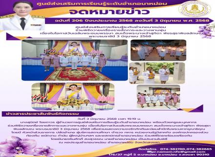 วันที่ 3 มิถุนายน 2568 เวลา 09.30 น. นางสุนิตย์ ไชยถาวร ผู้อำนวยการศูนย์ส่งเสริมการเรียนรู้ระดับอำเภอนาหม่อม พร้อมด้วยบุคลากร ร่วมลงนามถวายพระพรชัยมงคล เนื่องในโอกาสวันเฉลิมพระชนมพรรษา สมเด็จพระนางเจ้าสุทิดา พัชรสุธาพิมลลักษณ พระบรมราชินี 3 มิถุนายน